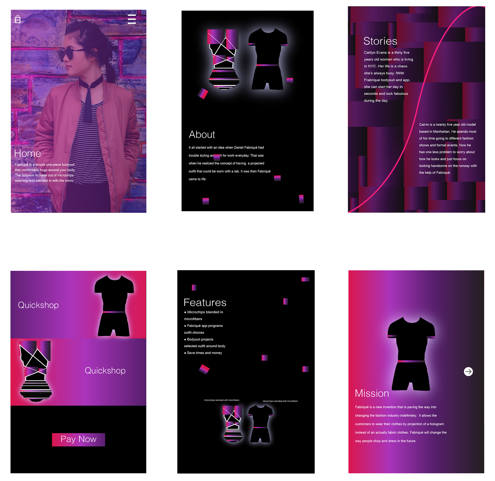 Web and mobile app design for Fabriqué. It is a fashion forward company that provides holographic outfits on the go, with just a button. The concept and design were well thought out and designed by me and my fellow graphic designer.